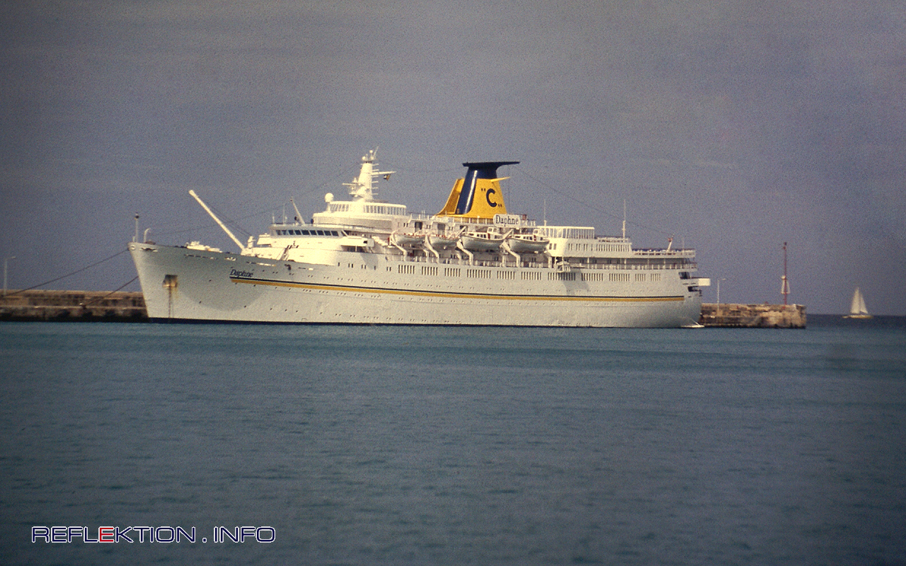 DAPHNE Zum Zeitpunkt der Aufnahme dieses Fotos im Jahre 1991 war DAPHNE bereits 37 Jahre alt und hatte ein bewegtes Schiffsleben hinter sich. 1954 in Newcastle als Stückgutfrachter PORT SYDNEY vom Stapel gelaufen ist das Schiff 1974 in ein Kreuzfahrtschiff umgebaut worden. Fortan hatten rund 450 Passagiere auf dem 163 Meter langen und 21 Meter breitem Schiff Platz. Zu diesem Zeitpunkt war es bereits in 4. Hand. 2007 ging es nach mehreren weiteren Umbauten an den 7. Eigentümer weiter, der das Schiff nun PRINCESS DAPHNE taufte. Zur Zeit fährt PRINCESS DAPHNE unter dem Management von World Cruise Agency in Lissabon. Man kann gespannt sein auf die nächsten 54 Jahre der PRINCESS DAPHNE.