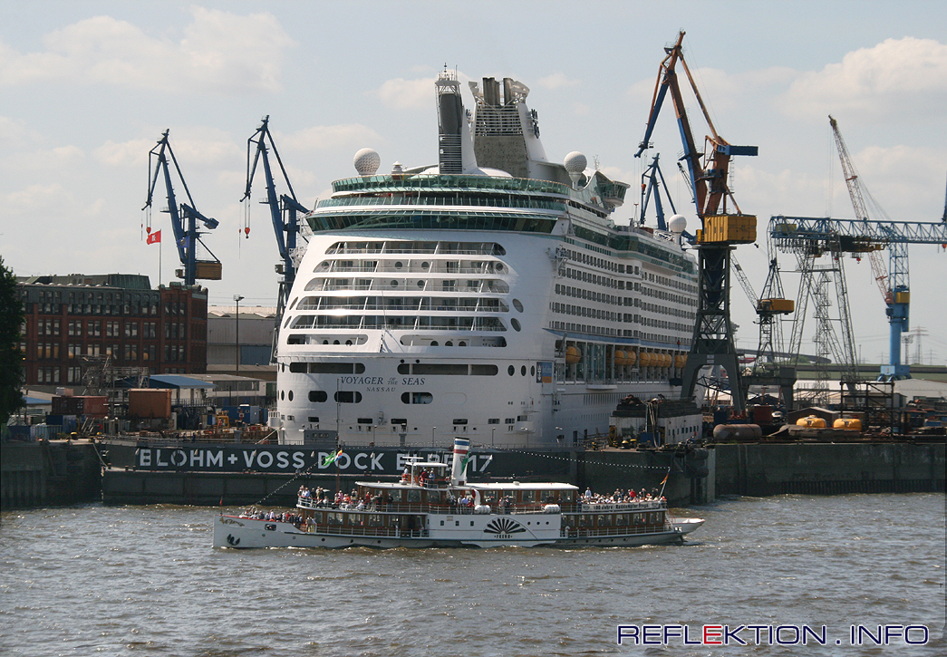 FREYA & VOYAGER OF THE SEAS Während des Hamburger Hafengeburtstags 2009 waren die 311 Meter lange VOYAGER OF THE SEAS und der 51 Meter lange Raddampfer FREYA in Hamburg. 5014 Personen (3838 Passagiere und 1176 Besatzungsmitglieder) fahren auf dem Kreuzfahrtschiff, der Raddampfer zählt 6 Mann Besatzung und höchstens 240 Passagiere. 140 PS leistet die Dampfmaschine der Freya - das reicht für rund 5 Knoten (rund 9 km/h) Höchstgeschwindigkeit. Die VOAYGER verfügt über 75.600 Kw und läuft maximal 23,7 Knoten (44 km/h). Die Vergleiche ließen sich endlos fortsetzen. Unterschiedlicher können 2 Schiffe eigentlich nicht sein - man sollte auf beiden einmal gefahren sein.