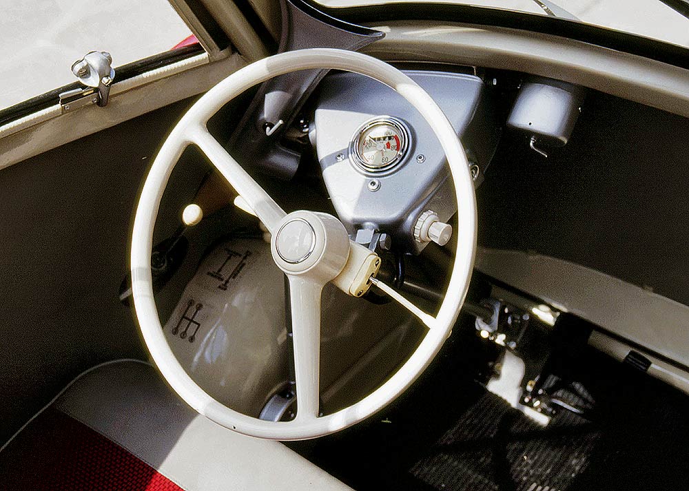Im April 1955 wurde das "Motocoupé" offiziell als BMW Isetta vorgestellt. Das eintürige Fahrzeug mit zweieinhalb Sitzplätzen (zwei Erwachsene, ein Kleinkind) fand schnell den Weg in die Herzen der Wirtschaftswunder-Deutschen. An der Fronttür waren Lenkrad und Armaturenbrett befestigt. Zwölf PS leistete der kleine Motor und verlieh dem Fahrzeug eine Höchstgeschwindigkeit von 85 km/h. Außerdem hielt die Tür auch noch das gewöhnungsbedürftige Schaltknüppelchen für die unsynchronisierte Klauenschaltung.