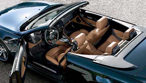 Im Innenraum bietet des neue M6 Cabrio höchste Exklusivität und die luxuriöse Ausstattung eines Automobils der Oberklasse, kombiniert mit dem Komfort eines 2+2 Sitzers. Im Cockpit sind die Funktionen perfekt am oder um das Lenkrad herum platziert. Tachometer und Drehzahlmesser sind mit röhrenförmigen Ringen in Chrom gefaßt. Vom Ziffernblatt in Schwarz heben sich die Zahlen in weiß und die Zeiger in traditionellem M-Rot ab.