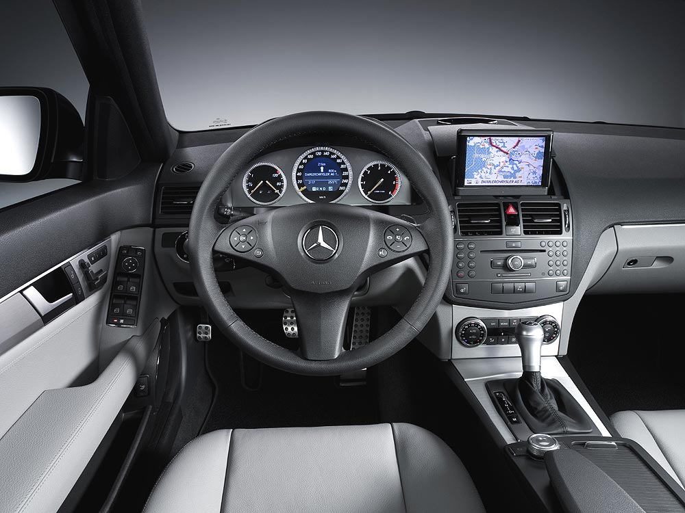 Bei der Gestaltung des Cockpits orientierten sich die Mercedes-Designer an sportlichen Vorbildern und zeichneten übersichtliche Rundinstrumente, wie man sie auch in Roadstern oder Coupés findet. Ebenso klar gegliedert präsentiert sich die zweifarbige Instrumententafel und die Mittelkonsole, die in der neuen C-Klasse eine formschöne Einheit bilden. Das gilt auch für die Integration des farbigen Anzeige-Displays im oberen Mittelbereich der Instrumententafel. Es liegt einerseits gut im Blickfeld des Autofahrers, läßt sich bei Bedarf aber auch zu- oder wegklappen, ohne das Autoradio, das Navigationssystem oder andere Geräte, die mit dem Display gekoppelt sind, auszuschalten. Wird der schwenkbare Deckel über dem Displayfach geschlossen, arbeiten die Infotainmentgeräte weiter.