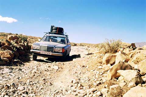 2001 in Marokko: Christian Zaic mit seinem unverwüstlichem 240 D, Baujahr 1980, auf Afrika-Tour. Der Tacho des Wagens zeigte bei dieser Aufnahme 456000 km an (Club W123)