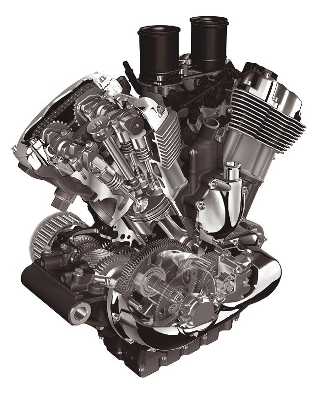 Der treffend REVOLUTION getaufte flüssigkeitsgekühlte 60°-V2-Motor der V-Rod mit vier obenliegenden Nockenwellen stammt aus der Werksrennmaschine VR 1000, mit der Harley an der US-Superbike-Meisterschaft teilnimmt. Das Renntriebwerk ist im Porsche Entwicklungszentrum in Deutschland zur Serienreife gebracht worden. Mit modernster Technologie, Kraftstoff-Einspritzung, Abgas-Katalysator und 117 PS aus 1.130 cm³ Hubraum setzt der neue Harley V-Twin ebenso neue Maßstäbe wie das unvergleichliche Styling der V-Rod, für das der legendäre Willie G. Davidson verantwortlich zeichnet - lang und flach, ganz in Aluminium und Chrom.