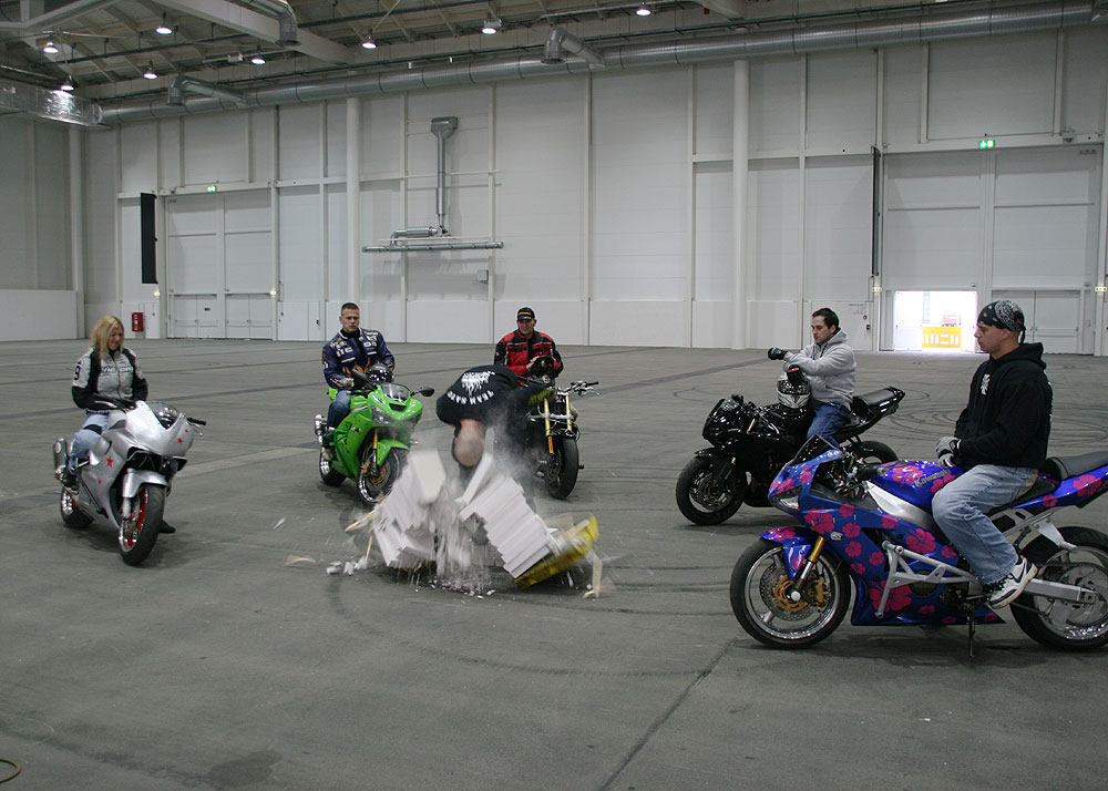 Ungläubiges Staunen bei den Fahrern als SATU der Bruchtestmeister einen Stapel Steine mit der Stirn mittig von oben nach unten teilt.