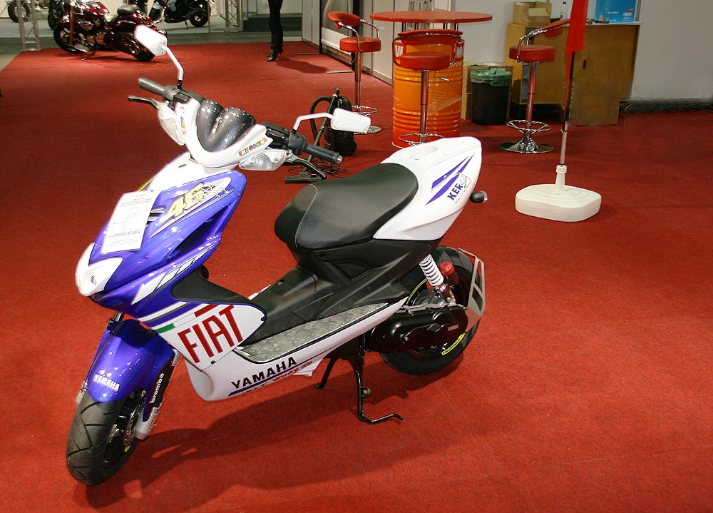 YAMAHA AeroxR Replica. Der Roller wird von einem 1-Zylinder-2-Takt-Motor angetrieben. Hubraum: 49 ccm, Leistung: 2,0 kW bei 6.500 U7min.