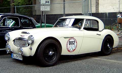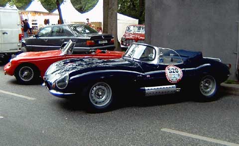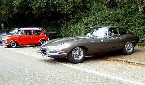 Jaguar E-Type, Baujahr 1969 - 3,8 L Hubraum - 262 PS; im hintergrund Austin Mini Cooper, Bj. 1989