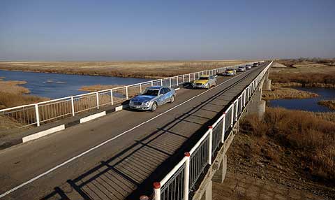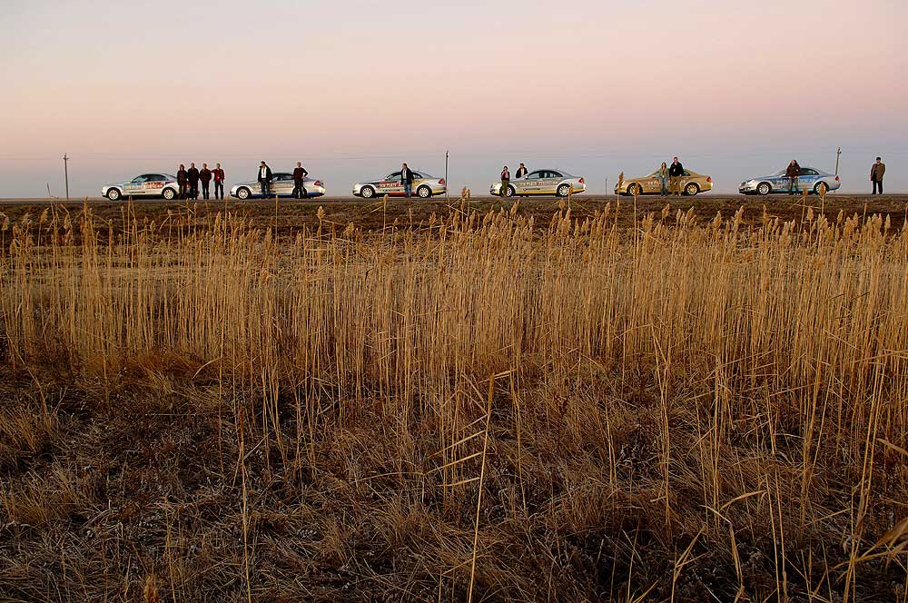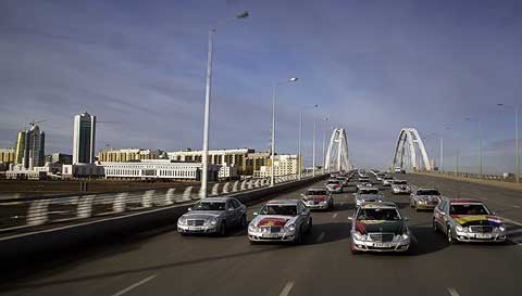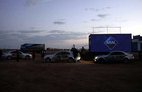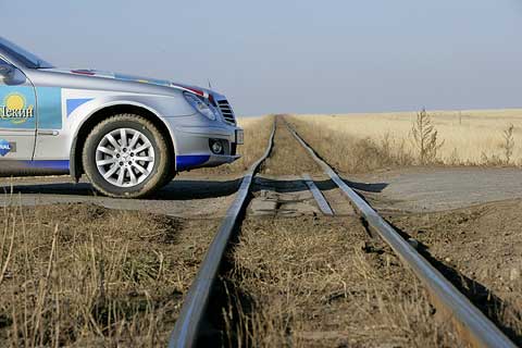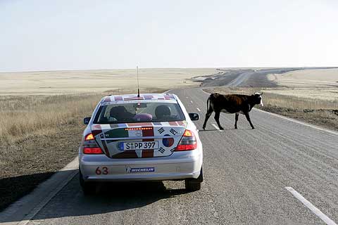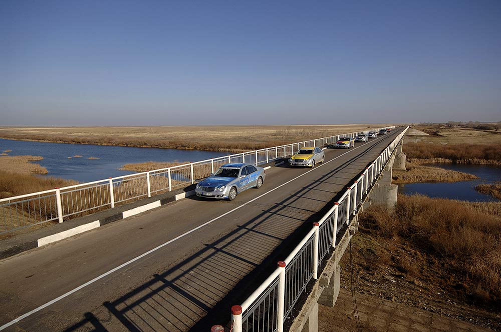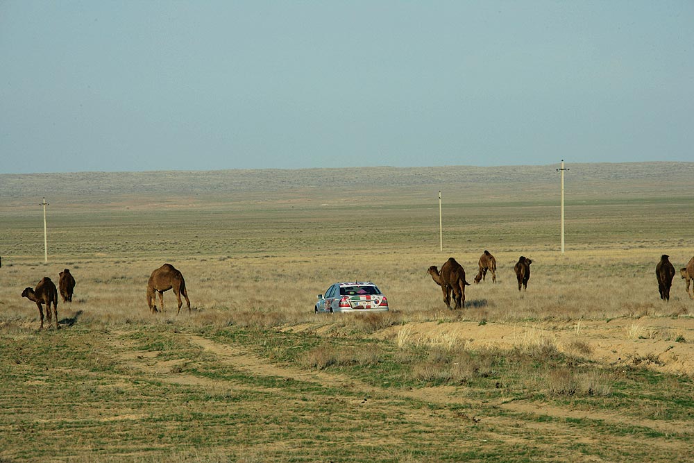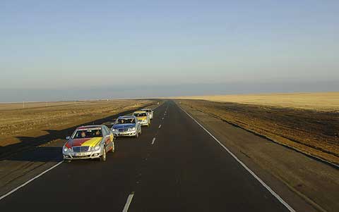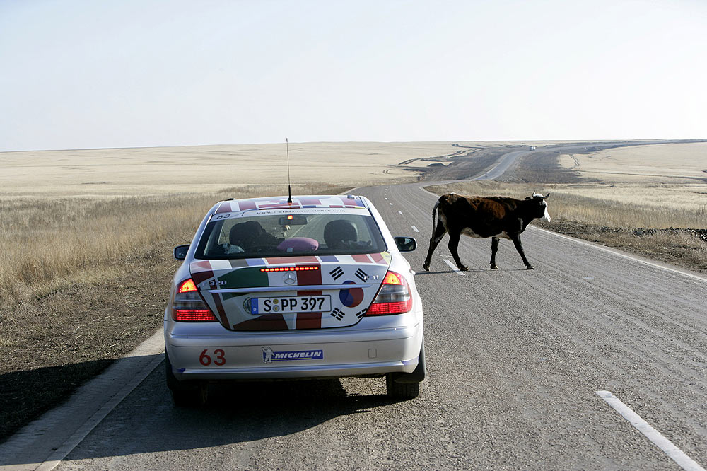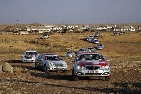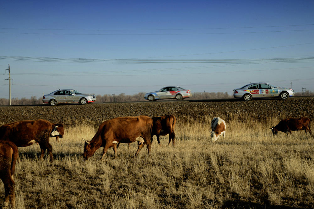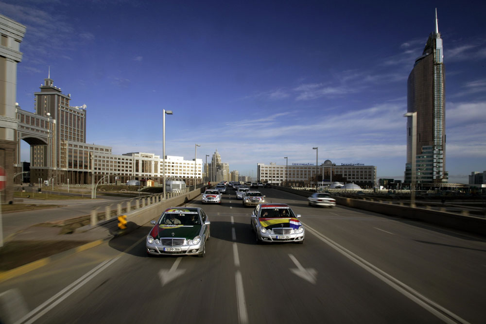 Begrüßt von einem herrlichen Sonnenaufgang starteten die Teilnehmer in Richtung Astana, die mit Temperaturunterschieden von bis zu 80 Grad Celsius als zweitkälteste Metropole der Welt gilt. Bei Temperaturen um den Gefrierpunkt in Kostanai und Mittagswerten von bis zu 15 Grad Celsius unterwegs hatten die Fahrer der E-Klassen gute Reisebedingungen. Sehr wechselhaft war dagegen die Beschaffenheit der Straßen, die von exzellent bis gefährlich reichte. Zahlreiche Schlaglöcher erforderten die volle Konzentration der Fahrer.