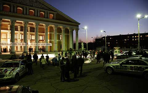 Eingewiesen von der örtlichen Polizei parkte die gesamte Langstrecken-Flotte aus zusammen 60 E-Klassen und Begleitfahrzeugen vor dem prachtvollen Bau des klassizistischen Kulturzentrums unweit des Ufers des Balchaschsees.