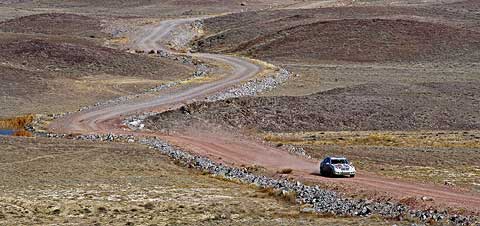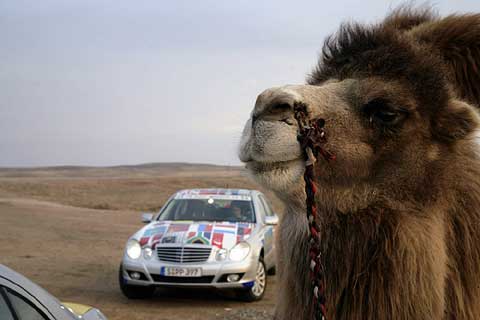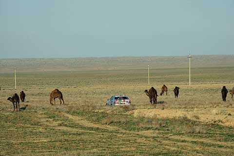 Nach den ausgesprochen flachen Ebenen der letzten Tage erreichten die Teilnehmer nun wieder hügeligere Gefilde, und zwischen die graugelben Steppenlandschaften mischten sich zum ersten Mal wieder grüne Grasflächen. Für Abwechslung sorgten auch die Kamelherden, die vereinzelt anstelle von Pferden oder Kühen rechts und links der Straße grasten.