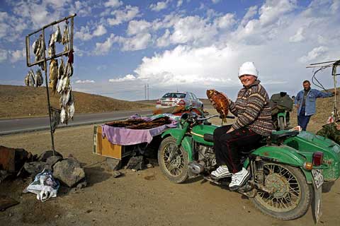 Viele fliegende Fischhändler mit luftgetrockentem Fisch säumen hier die Landstaße nach Almaty