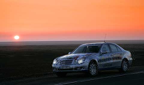 4.11.2006 – 14. Tag Die E-Klassenflotte erreicht die kasachische Hauptstadt Astana Fünfzehnte Tagesetappe über gut 700 Kilometer nach Astana Wetter: klar und sonnig bis zu 15 Grad Celsius Neuer Tagesrekord mit Durchschnittsverbrauch von 5,9 Litern Diesel