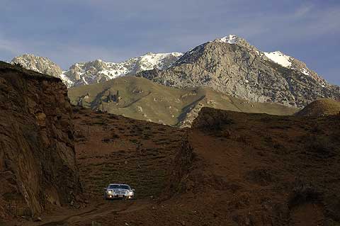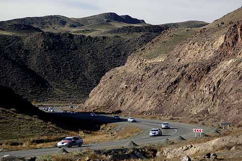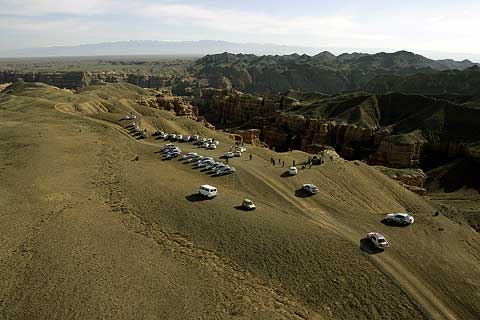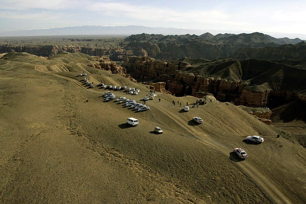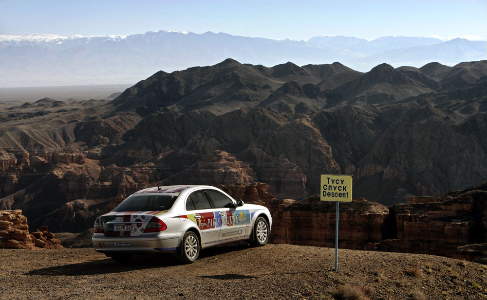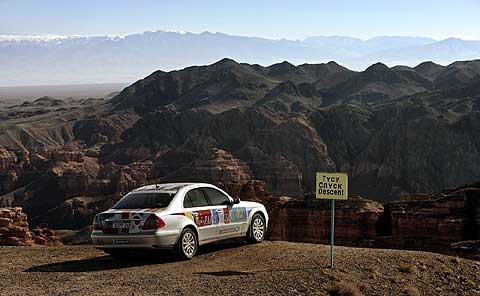 Nach 160 Kilometern wechselte die Landschaft in das Bergland des Altau-Massivs. Auf einem geschotterten Privatweg gelangte der Tross zum Sharyn Canyon, einem bis zu 350 Meter tiefen Tal, in das sich der Sharyn – ein Seitenfluss des Ili – seinen Weg in den roten Sandstein gewaschen hat. Auf der Zufahrt stellten die E-Klassen überraschende Off-Road-Tauglichkeit unter Beweis. Die holperige Anfahrt wurde aber reich belohnt: Grand-Canyon-Kulisse in den kasachischen Bergen.