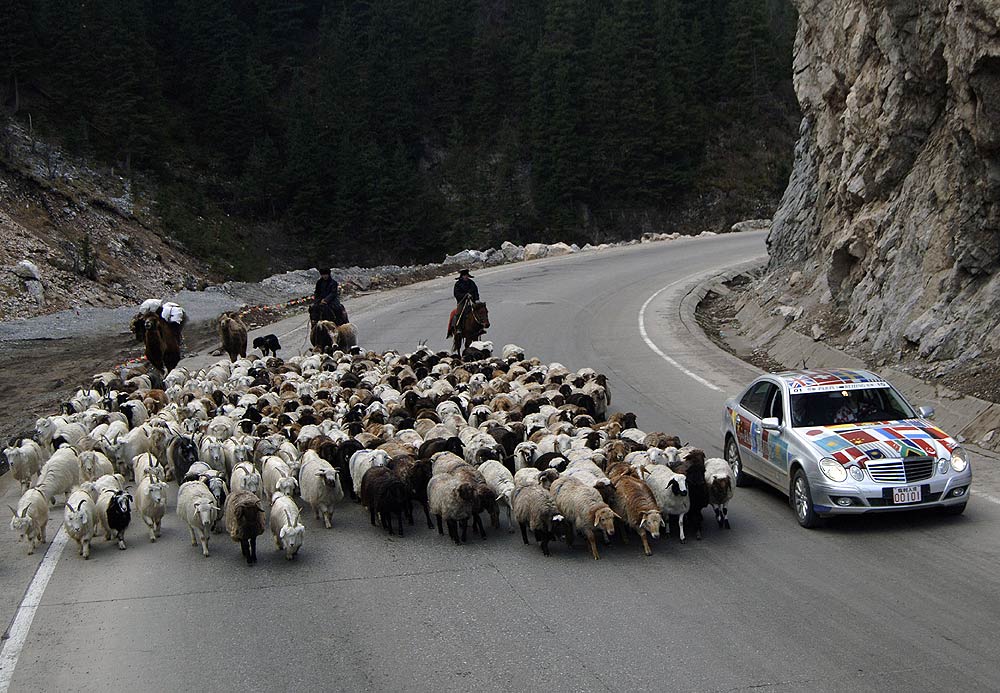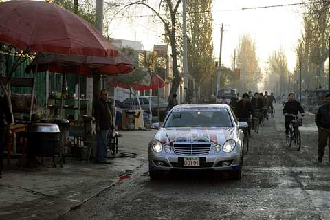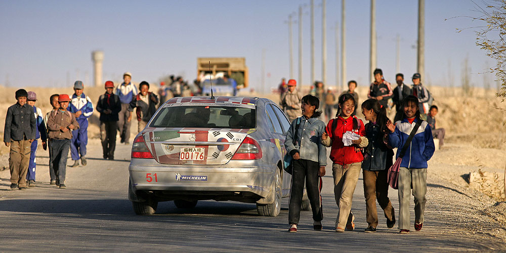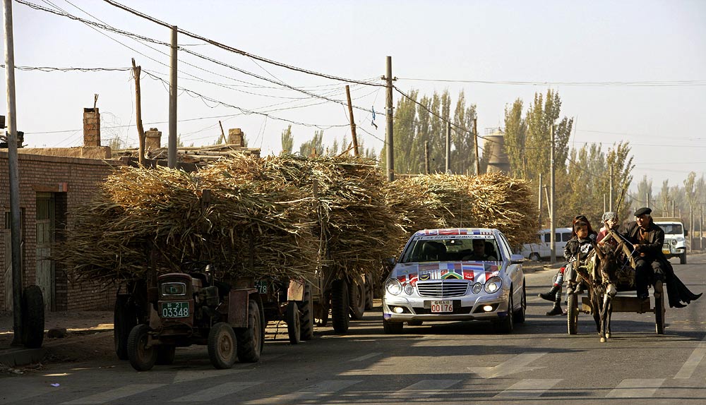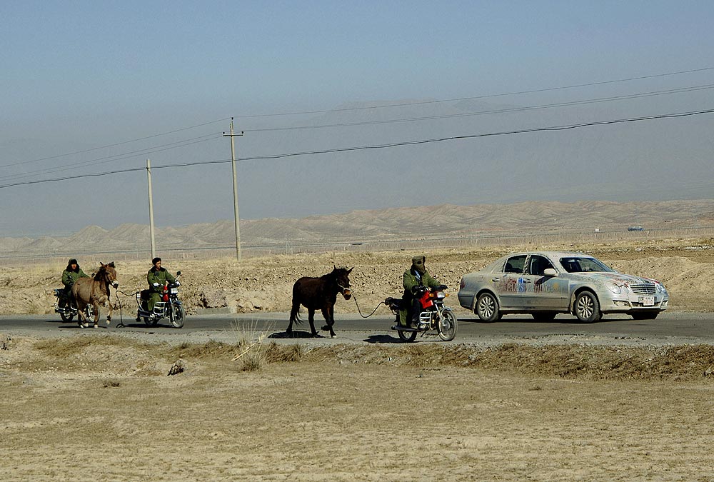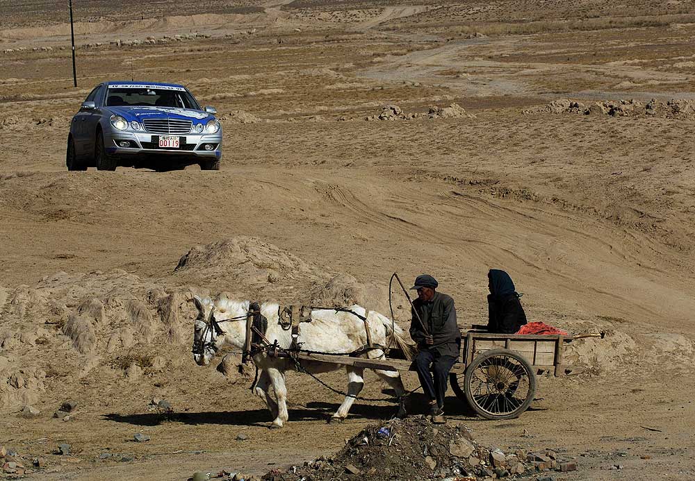 Je ärmer die Gegend, desto freundlicher die Menschen: An den Straßen wurde den E-Klassen, die hier wie von einem anderen Stern wirken, oft begeistert zugewunken. Die breite Verbindungsachse nach China folgt im Tal des Ili den historischen Spuren der Seidenstraße, erinnert heute aber mit ihren zahllosen Tankstellen, Straßendörfern und fliegenden Händlern für Waren aller Art von Gemüse bis Motoröl eher an die legendäre Route 66 in den USA.