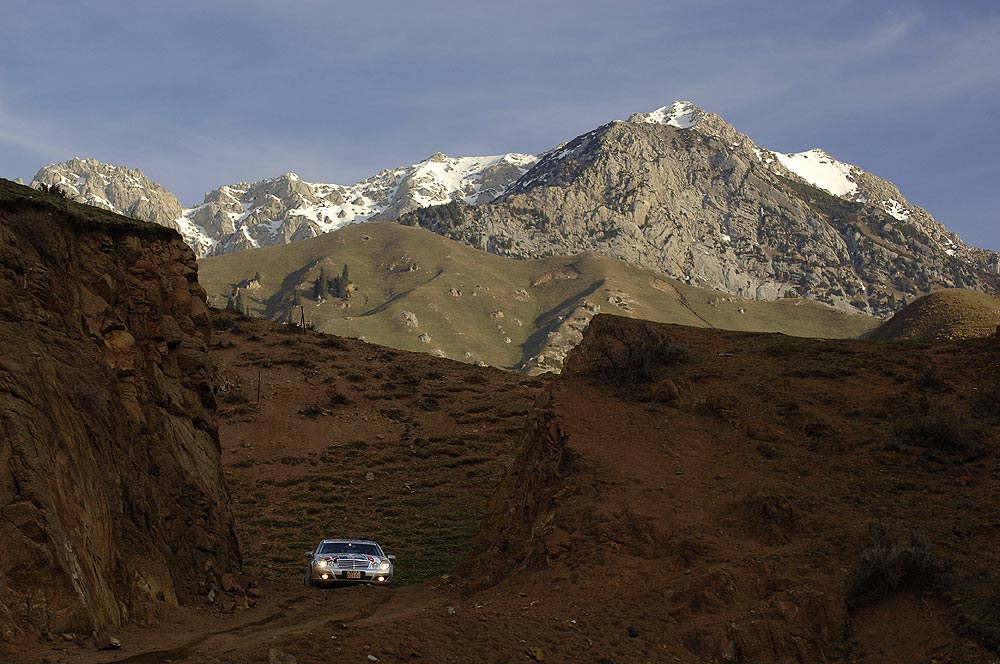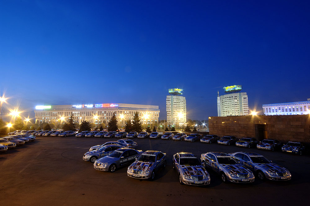 Zwischen Almaty und Korgas gab es den dritten Blechschaden der Langstreckenfahrt, als ein kasachischer Lada auf die G-Klasse eines der Foto-Teams auffuhr. Wie bei den beiden vorherigen Unfällen – zwischen St. Petersburg und Moskau touchierte ein Lkw die E-Klasse Nummer 12, bei der Überquerung des Urals wurde E-Klasse 5 von einem entgegenkommenden Lada seitlich geschrammt – ging der Zusammenstoß zum Glück glimpflich und ohne Personenschäden ab.