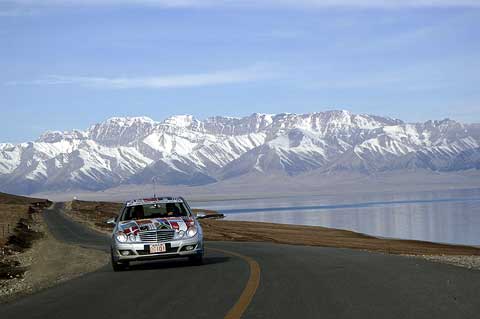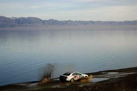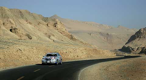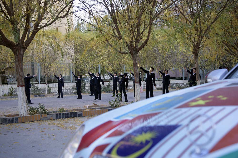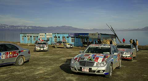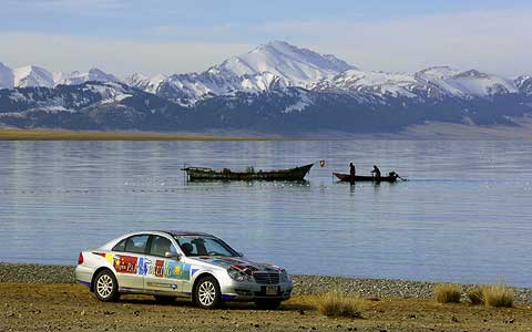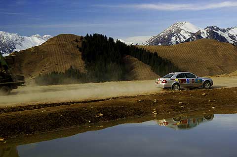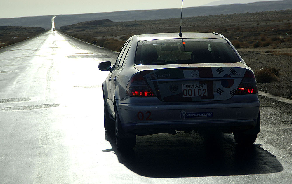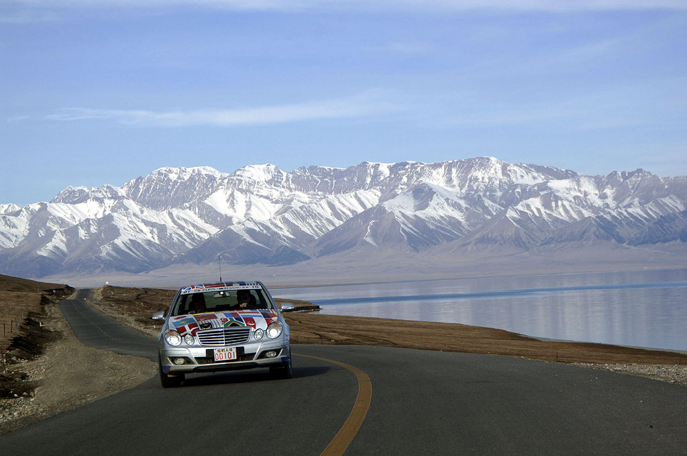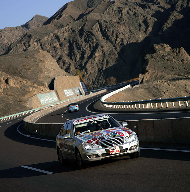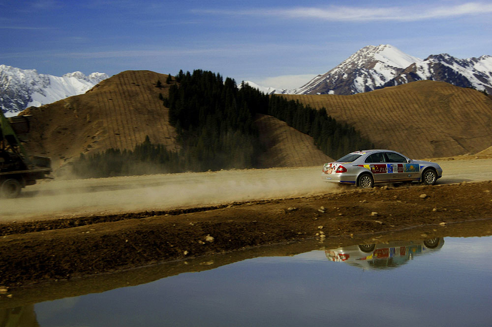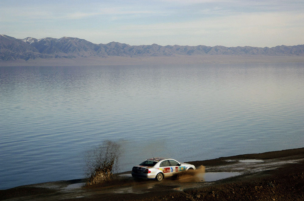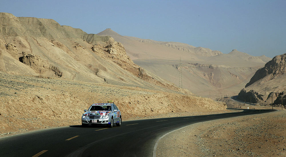Im Schatten des Himmelsgebirges führte die Route über kurvenreiche Paßstraßen durch die Provinz Xinjiang in das Dsungarische Becken. Der Zwischenstopp am Ebinur See sorgte für erhebende Aussichten, bevor ein langes Stück Autobahn von den Qualitäten des chinesischen Straßenbaus überzeugte. Der Empfang am frühen Abend in der neu gebauten Mercedes-Benz Vertretung in Ürümqi erinnerte erneut an einen Staatsbesuch, Begrüßungsfeuerwerk inklusive.