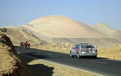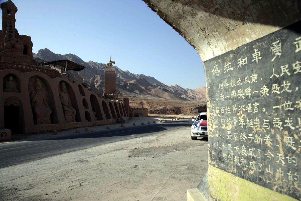 Die zunächst noch sanft hügelige Topografie wechselte nach 140 Kilometern Fahrt auf gut ausgebauter Autobahn in eine immer schroffere Felsenformation mit vorgelagerter Ebene. Nach der Rub al-Chali in Arabien ist die im chinesischen Tarim-Becken gelegene Taklamakan die zweitgrößte Sandwüste der Erde. Ein unbewohntes Gebiet mit einer Fläche von 360.000 Quadratkilometern in etwa so groß wie Deutschland. Der rund 15 Meter breite Mittelstreifen, die fehlenden Leitplanken und die schnurgeraden Asphaltbänder ließen bei weit gereisten Mitstreitern Erinnerungen an Interstates in den USA aufkommen. Die Schätze dieser Gegend stecken verborgen unter der kargen Oberfläche, wie zahlreiche Ölförderpumpen am Wegesrand verraten.