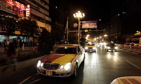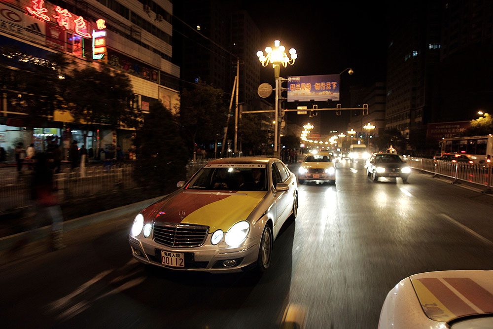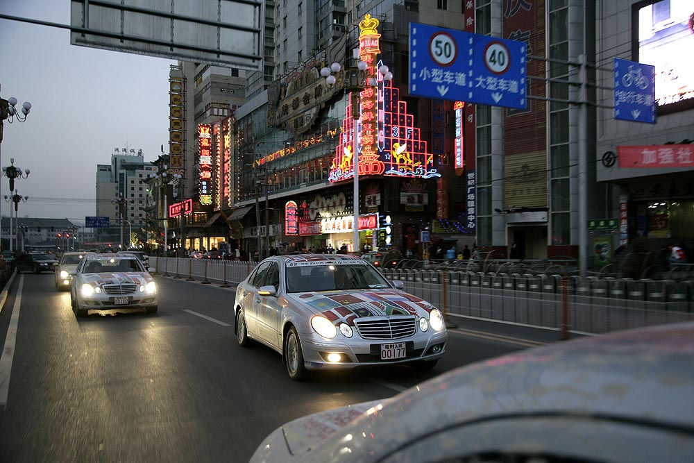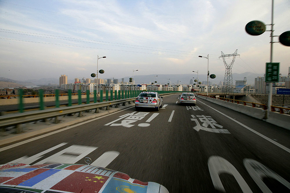 So ging es erst bei mittlerweile stockfinsterer Nacht auf die letzten 80 Kilometer zum Tagesziel, vorneweg zwei chinesische Polizei-Streifenwagen, dahinter in langer Schlange alle Teilnehmer- und Crewfahrzeuge. Auf Wunsch der lokalen Behörden sollten die ersten Kilometer auf chinesischen Straßen erneut im Konvoi zurückgelegt werden, so daß die ersten Grenzgänger von Korgas auf die letzten warten mussten. Zum Glück sorgte jetzt staatliche Organisation für zügiges Vorankommen. An jeder Kreuzung stand ein Verkehrspolizist und stoppte den übrigen Verkehr, damit die E-Class Experience freie Fahrt erhielt. Viele der Teilnehmer wunderten sich: Chinesen scheinen nie zu schlafen. Selbst kurz vor Mitternacht bevölkerten noch Kleinkinder die Bürgersteige, Läden waren geöffnet und Bauarbeiten im vollen Gange.