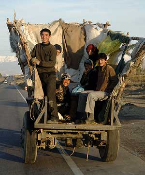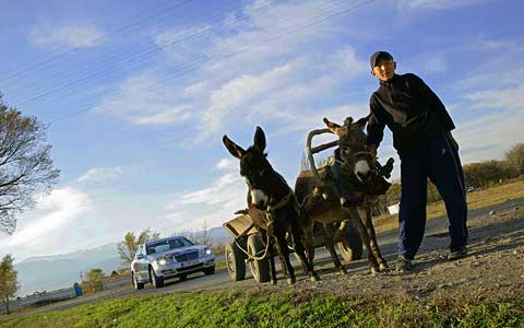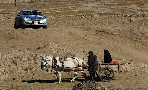 Auch der ein-, zwei- oder dreispännige Eselskarren gehört in dem zentralasiatischen Land noch immer zum allgegenwärtigen Verkehrsmittel. Zäune gibt es auf den schier grenzenlosen Weiden nicht, so daß das Vieh ungeniert den Weg kreuzt. Entsprechend vorsichtig reagierten die Fahrer auf die vierbeinigen Verkehrsteilnehmer.