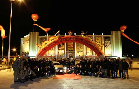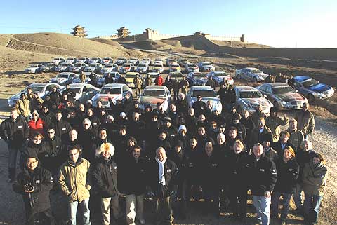 Vor dem Start zur letzten Etappe für die vierte Gruppe hatte die Tourleitung ein großes Fotoshooting gesetzt. Mitten im Gelände vor der Festung von Jiayuguan trafen sich alle Teilnehmer zum abschließenden Gruppenbild mit ihren Fahrzeugen. Angesichts des eiskalten Windes waren alle Beteiligten, insbesondere die Fotografen, froh, daß die Aufnahmen schnell im Kasten waren.