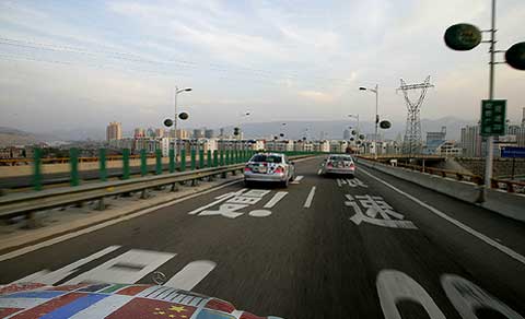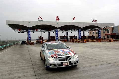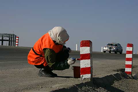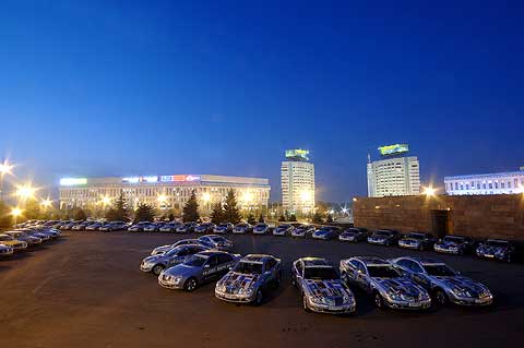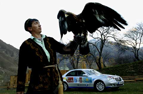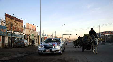 Die letzte Grenze auf dem Weg nach Peking wurde schließlich in drei Gruppen überquert, wobei die rund drei Stunden Wartezeit in Korgas als schnell gelten. Die chinesischen Offiziellen bemühten sich redlich um eine beschleunigte Abwicklung der Mercedes-Benz Flotte. Mit dem bloßen Abstempeln von Pässen und Visa ist es am Übergang in das Reich der Mitte aber nicht getan. So bekamen die E-Klassen neue amtliche Kennzeichen und die Fahrer einen chinesischen Führerschein. Der außergewöhnliche Kennzeichenwechsel gehört zu den zahlreichen Besonderheiten des chinesischen Verkehrsrechts, mit dem sich die Teilnehmer in den kommenden Tagen auseinandersetzen mußten. In allen anderen acht Ländern der Langstreckenfahrt durften die Mercedes-Benz E 320 CDI mit ihren deutschen Nummernschildern unbehelligt am öffentlichen Straßenverkehr teilnehmen. Martin Hintermaier vom GSP Serviceteam hatte extra Bohrschablonen und eine Biegeeinrichtung angefertigt, damit die Schilder schnell und dennoch perfekt montiert werden konnten.