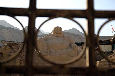 Die Hinweisschilder mit chinesischen Schriftzeichen und englischen Texten beweisen jedenfalls den festen Willen zur Öffnung des Landes für Reisende aus aller Welt. Große gelbe Warntafeln erinnern daran, nicht einzuschlafen. Angesichts der selten auftauchenden Fahrzeuge eine durchaus sinnvolle Warnung. Steinerne Gewächshäuser und sorgfältig gepflügte Äcker wiesen auf den fruchtbaren Boden in der Ebene von Gansu hin. Der Übergang von der Agrargesellschaft zur Industrienation ist hier überall zu spüren. Rund um die Industriestandorte wachsen die Städte und bieten den Bewohnern bessere Konsum- und Wohnmöglichkeiten, allerdings auch um den Preis einer starken Umweltbelastung, die zu sehen und zu riechen ist. Das Tuch über Mund- und Nase, das hier viele Menschen tragen, dient nicht nur als Schutz vor den allgegenwärtigen Sandwinden.