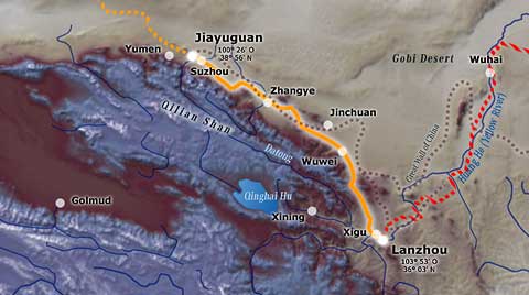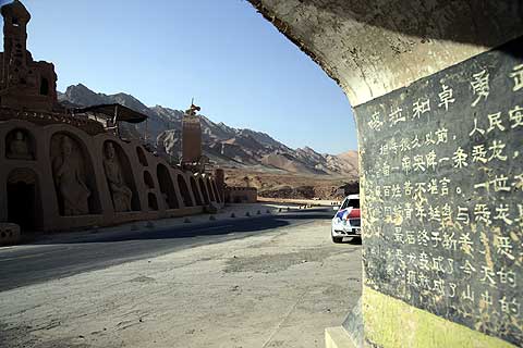 Von Jiayuguan, einer erst vor 40 Jahren gegründeten Stadt, die heute schon 190.000 Einwohner hat und vom Eisenerz lebt, ging es Richtung Südosten zum Fuße des Qilian Shan Gebirges. Der Qilian Shan ist Teil der so genannten Südberge, der Nan Shan. Diese 6346 Meter hohe Gebirgskette erstreckt sich unter anderem über die Provinz Gansu und die Innere Mongolei. Auf der neuen, perfekt ausgebauten und fast leeren Autobahn legte der Tross die ersten 240 Kilometer schnell und entspannt zurück – auch wenn immer wieder Menschen ungeniert auf der Mittelleitplanke saßen, Körbe flochten oder Obst verkaufen wollten und durch dieses hier absolut übliche Verhalten eine vorsichtige Fahrweise erforderten.