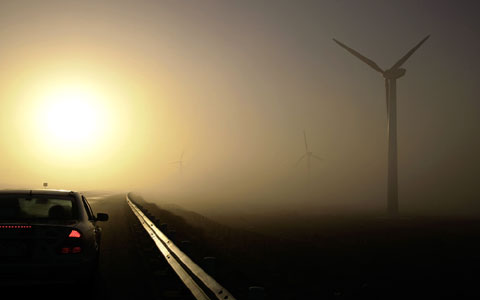 Die Windkraftanlagen von Dabancheng bei Dunst und Gegenlicht