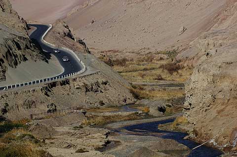 Immer bremsbereit sein: Die Route führt über kurvenreiche Paßstraßen durch die Provinz Xinjiang in das Dsungarische Becken
