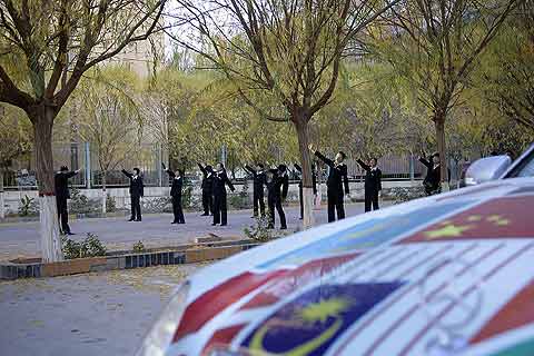Der Start in den Morgen in Hami war für die nicht-chinesischen Teilnehmer gewöhnungsbedürftig gewesen: Zum Frühstück standen Zuckerbrot, gesüßte Butter, in Öl satt getränkte Spiegeleier und Hühnersuppe auf dem Tisch. Der gemeinsame Frühsport des Hotelpersonals auf dem Parkplatz zu zackiger Marschmusik erfüllte jedes landestypische Vorurteil, wurde aber von den Turnern im Anzug selbst nicht so ganz ernst genommen.