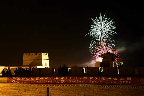 Bei der Ankunft in Jiayuguan erwartete die erschöpften, aber glücklichen Langstreckenfahrer eine weitere Überraschung: In der gleichnamigen, ab 1372 errichteten und heute umfangreich rekonstruierten Festung empfing ein typisch chinesisches Feuerwerk die Besucher. Die 33.500 Quadratmeter große Anlage ist von einer zehn Meter hohen und 730 Meter langen Mauer umgeben und wird im Inneren von zahlreichen weiteren Wällen, Wachtürmen und Gebäuden bestimmt. Sie markiert die westliche Grenze der großen chinesischen Mauer. Diese wird die Teilnehmer der E-Class Experience auch in den kommenden Tagen beim Endspurt nach Peking begleiten.