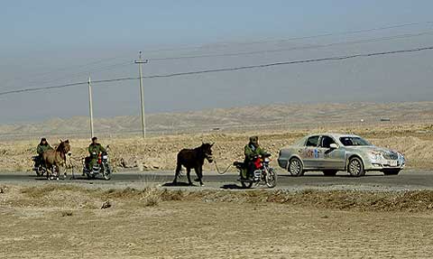Auf dem weiteren Weg übernahm ein Lada-Polizeiwagen der örtlichen Behörden die Führung und geleitete den Konvoi der E-Klassen in geschlossener Formation bis kurz vor die chinesische Grenze, die normalerweise abends um 18.00 Uhr geschlossen wird.