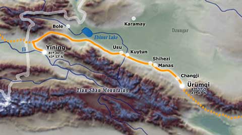 Die Provinzhauptstadt Ürümqi war noch in den 1950er Jahren nur schwer zu erreichen. Erst mit der Fertigstellung der Eisenbahnlinie von Lanzhou nach Ürümqi begann der Aufschwung. Heute gilt die küstenfernste Stadt der Erde als Boomtown von Westchina.