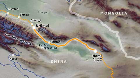 10.11.2006 – 21. Tag Start in Ürümqi, der küstenfernsten Stadt der Erde 21. Tagesetappe über 608 Kilometer nach Hami Wetter: erst nebelig, dann sonnig, 9 bis 18,5 Grad Celsius