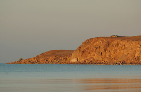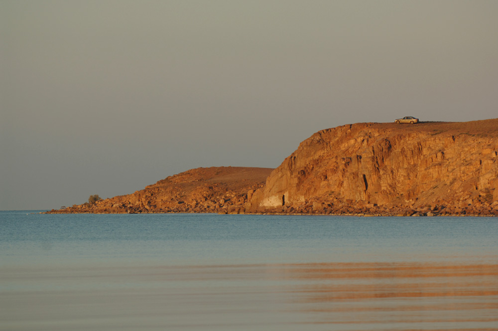 Balchasch (Kasachstan): Der Sonnenuntergang am Balchaschsee taucht Landschaft und Auto in überwältigendes Kupferrot