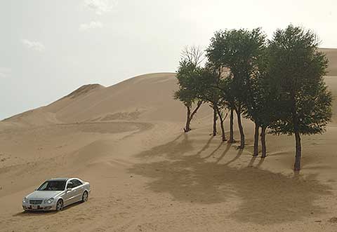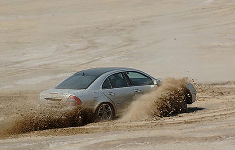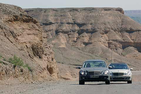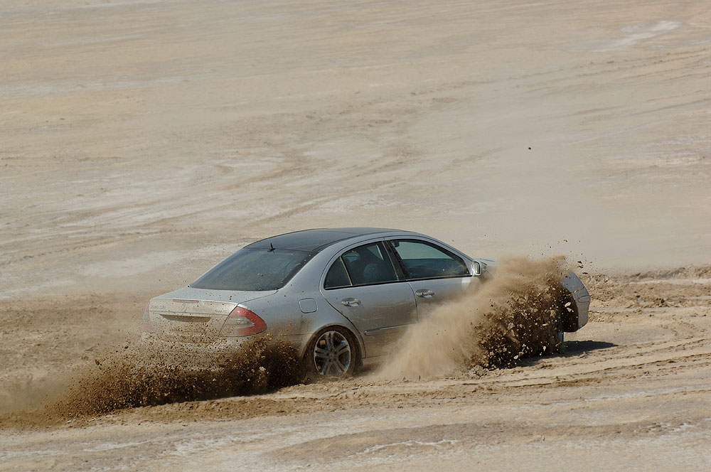 Betpak-Dala, Hungersteppe (Kasachstan): Karussellfahren auf Sand in engsten Kurven macht viel Spaß und ist gleichzeitig ein Härtetest für den E 320