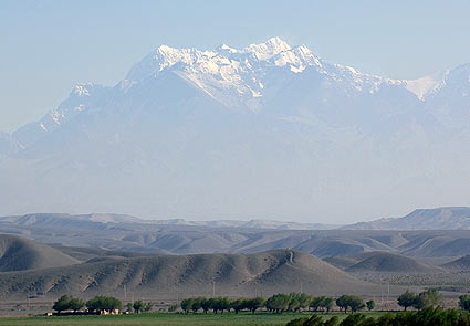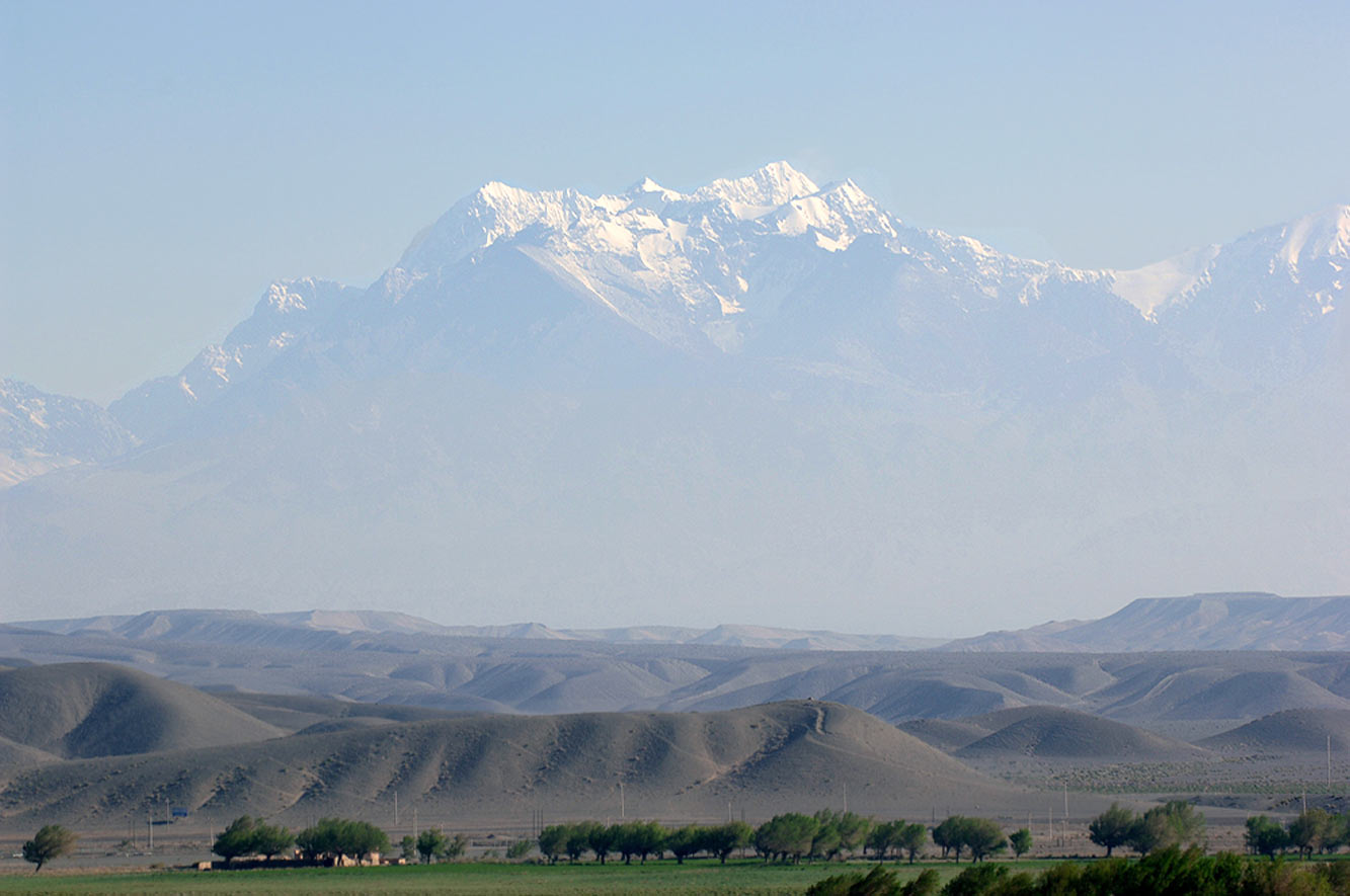 Von Jiayuguan nach Lanzhou (China): Im Hintergrund die Gebirgskette des Tian Shan