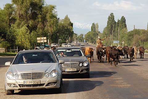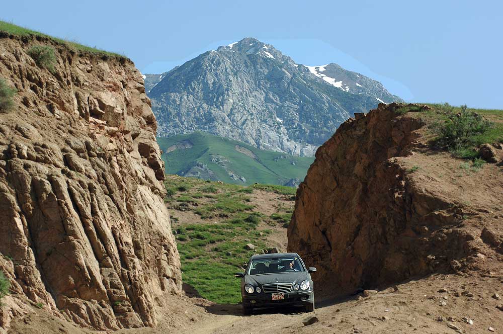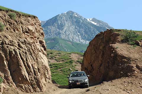 Almaty in Kasachstan. Im Hintergrund sind einige Begleitfahrzeuge (G-Klasse) der Vorausexpedition zu entdecken. Eindrucksvoll und majestätisch erscheint die gewaltige Bergkette mit ihren mehr als 4500 Meter hohen Gipfeln am Horizont