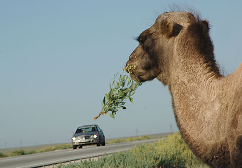 Von Balchasch nach Almaty: wildlebende Steppenkamele in der kasachischen Steppe beim Lunch
