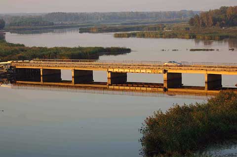 Auf dem Weg nach Astana durch Wälder und Flußauen in Kasachstan. Das Sonnenlicht läßt die sich im Wasser spiegelnde Betonbrücke in kräftigen Goldtönen leuchten.