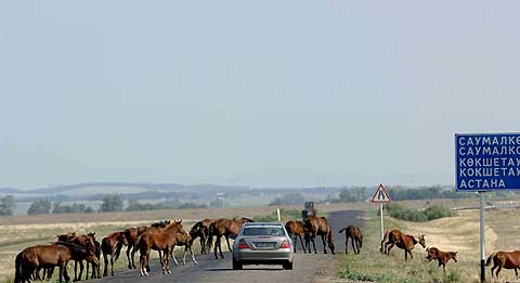 Von Kostanaj nach Astana (Kasachstan): Vorfahrt für die Herde der Steppenpferde....