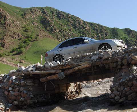 Von Yining nach Urümqi (China). Abenteuerlich zusammen gesetzte Brücke aus Hölzern, Steinen und vielen Seilen.