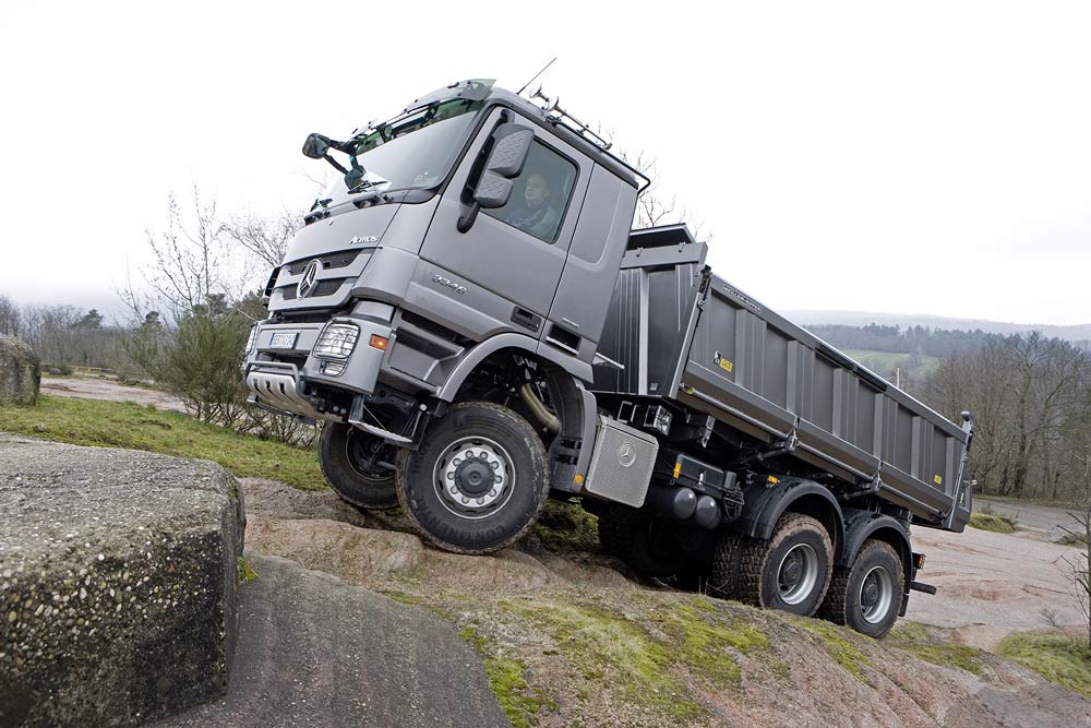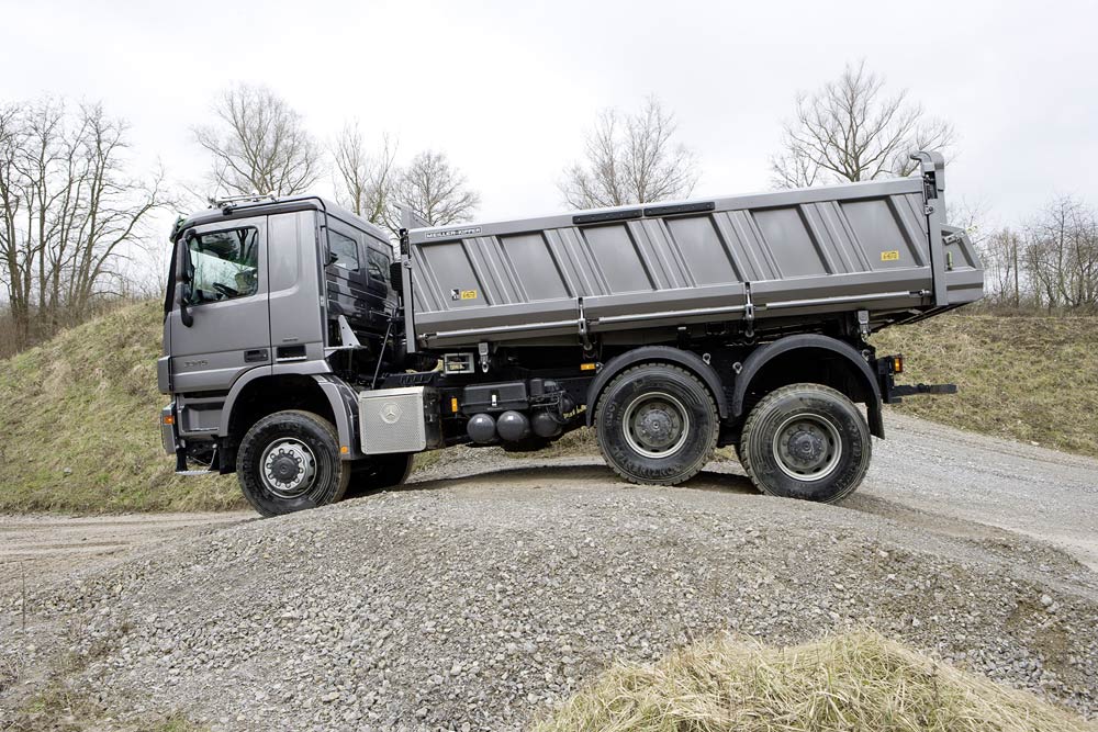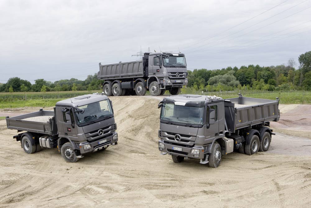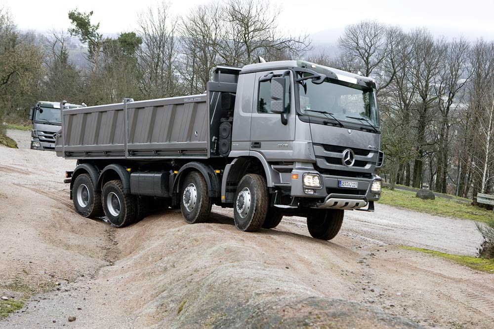 Gewichtsmäßig sind bei den Actros-Baufahrzeugen vom zweiachsigen 18-Tonner bis zum 41 Tonnen schweren Vierachser alle gängigen Varianten darstellbar. Kipper und Muldenkipper der Kategorie erfüllen ihren Transportauftrag überwiegend abseits öffentlicher Straßen. Zwischen den Eckwerten 18 und 41 Tonnen rangieren die 6x2- und 6x4-Dreiachser, die es ebenfalls in unterschiedlichen, überladefähigen Ausführungen zwischen 25 und 33 Tonnen gibt. Hinzu kommen Sattelzugmaschinen mit zwei und drei Achsen – auch mit einfachbereifter, gelenkter Vorlaufachse 6x2/4 –, sowie dreiachsige Lastkraftwagen für den überwiegenden Straßeneinsatz als 6x2 sowie im Baustoffverteilerverkehr als 6x2/4 mit gelenkter “Telligent-Nachlaufachse”. Und schließlich gibt es 6x2-Fahrzeuge mit doppelt bereifter Nachlaufachse.