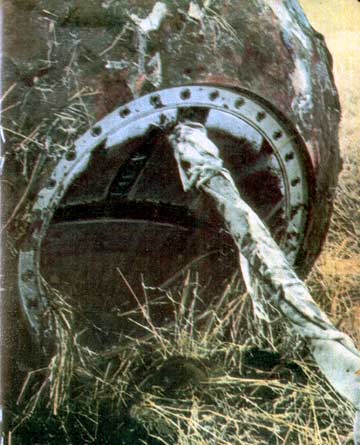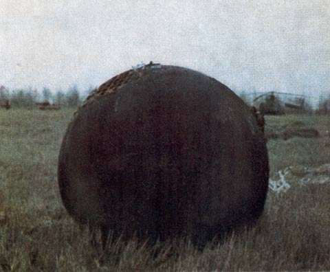 Die Kapsel Wostok 1 nach der Landung in Sibirien - im Hintergrund ein Armeehubschrauber