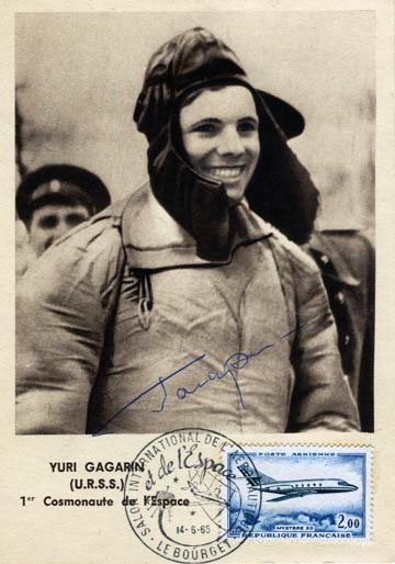 Juri Gagarin einige Tage vor dem Start. Das Autogramm wurde 1965 in Paris nachgesetzt.