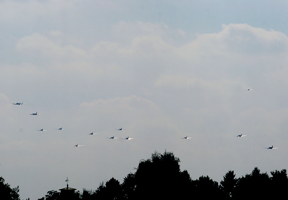 13 Formationsflieger über dem Flughafen. Ganz vorn und ganz klein neben dem rechten Mast die AT-6
