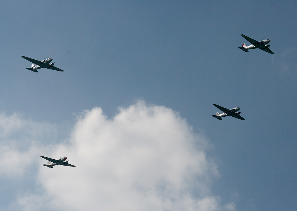 4 DC-3: vlnr. FLYING DUTCHMEN, DAKOTA NORWAY, FINNAIR, DANISH DAKOTA FRIENDS