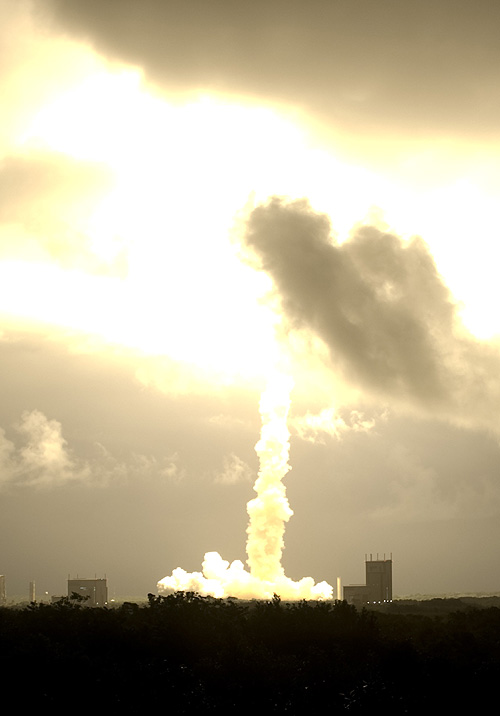 Am 9. März 2008 um 5.03 Uhr MEZ (1.03 Uhr Ortszeit) erfolgte der erfolgreiche Start von JULES VERNE vom Raumfahrtzentrum Guayana, Europas Raumflughafen in Kourou in Französisch Guayana.