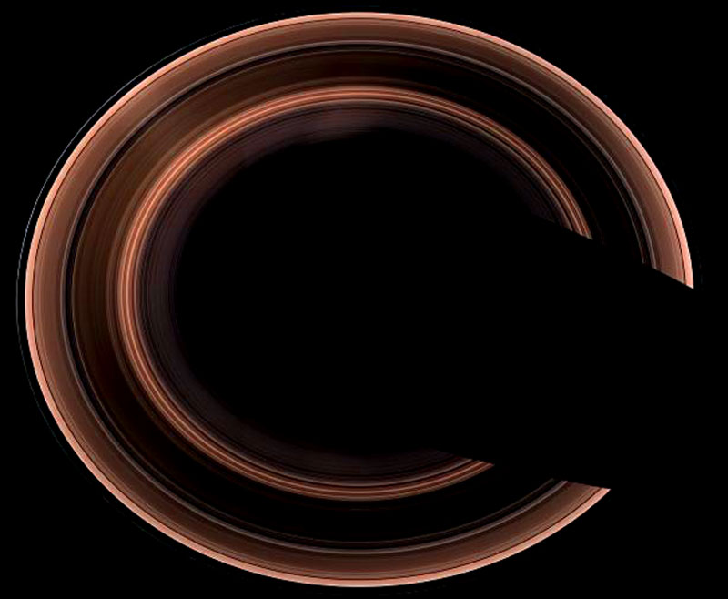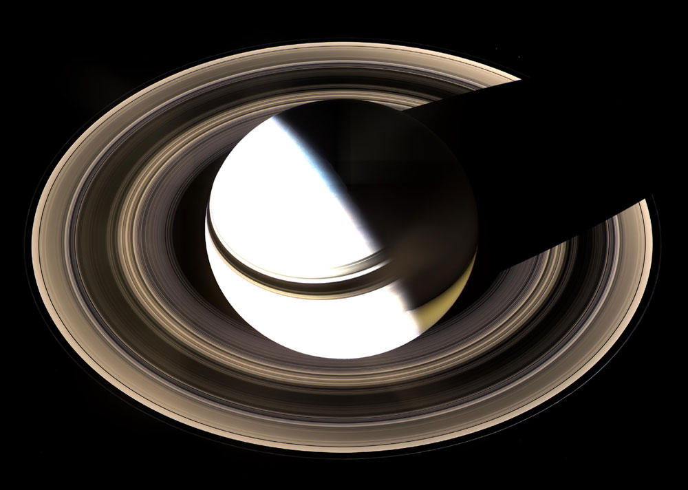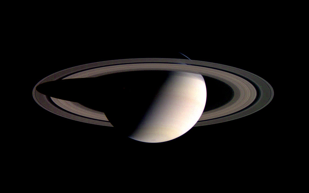 Aus einem Winkel unterhalb der Ringe ist deutlich die Tag/Nachttrennung und der Schattenwurf zu betrachten.