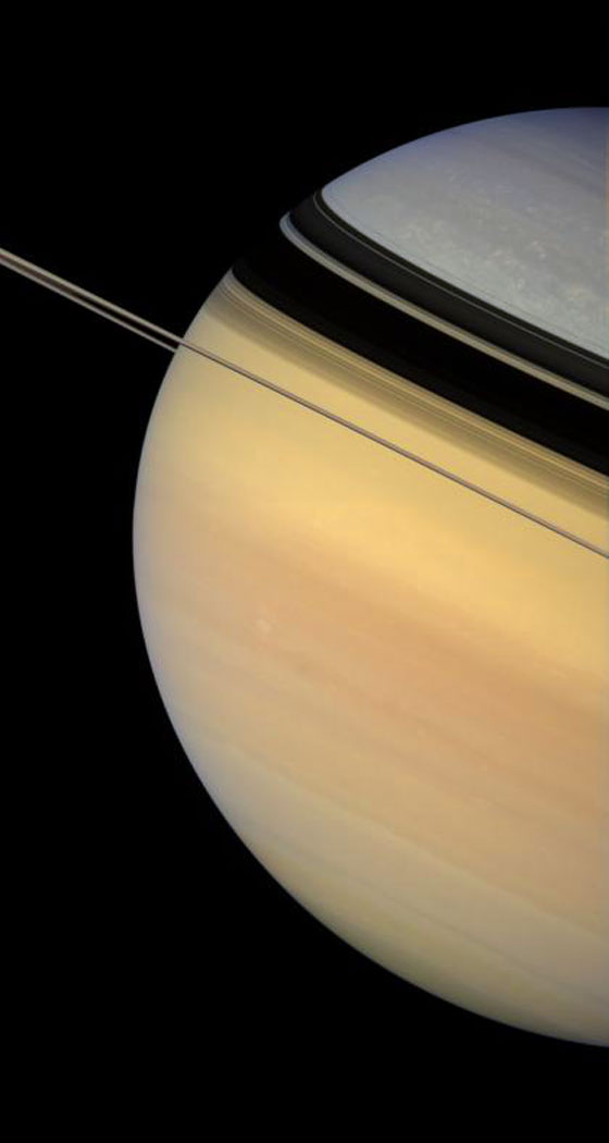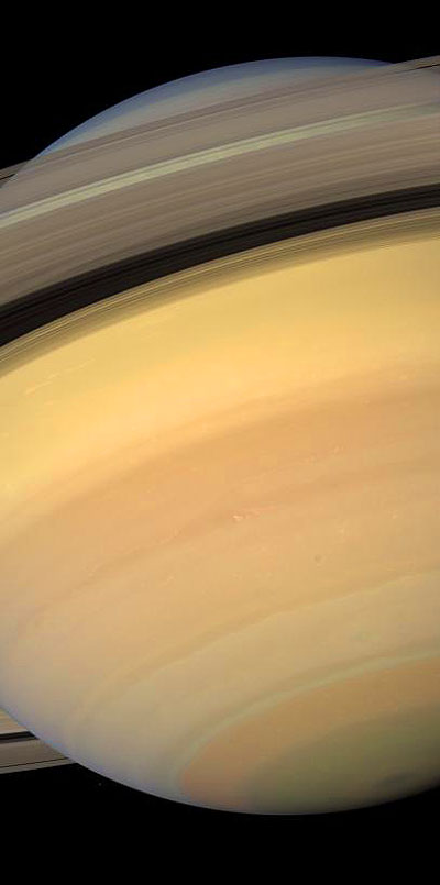 Der Saturn mit seinen statischen, glänzenden Ringen bietet eine der überwältigendsten Anichten des ganzen Sonnensystems.Zwischen dem hellen Tageslicht und dem Dunkel der Nacht ist ein Streifen von Dämmerung, der farbliche Details in seiner Atmosphäre zeigt. In die bläulich-graue Polregion sind hineingesprenckelte, leuchtende Wolken zu sehen. Im Süden glüht golden die sonnenabgewandte Seite im reflektierten Licht der sonnenbestrahlten Ringe.