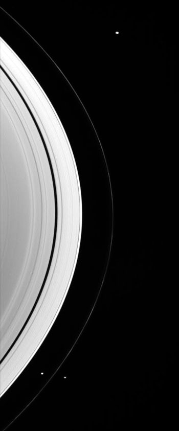 Auf diesem Bild sind drei kleine Monde zu sehen. Die beiden Ringe umgeben die Monde Prometheus (102 Kilometer im Durchmesser) und Pandora (84 Kilometer im Durchmesser). Sie flankieren den Ring am unteren Rand. Weiter oben ist der Saturnmond Janus (181 Kilometer im Durchmesser) zu erkennen. Den Zusammenhang vermittelt die Großansicht des Bildes.
